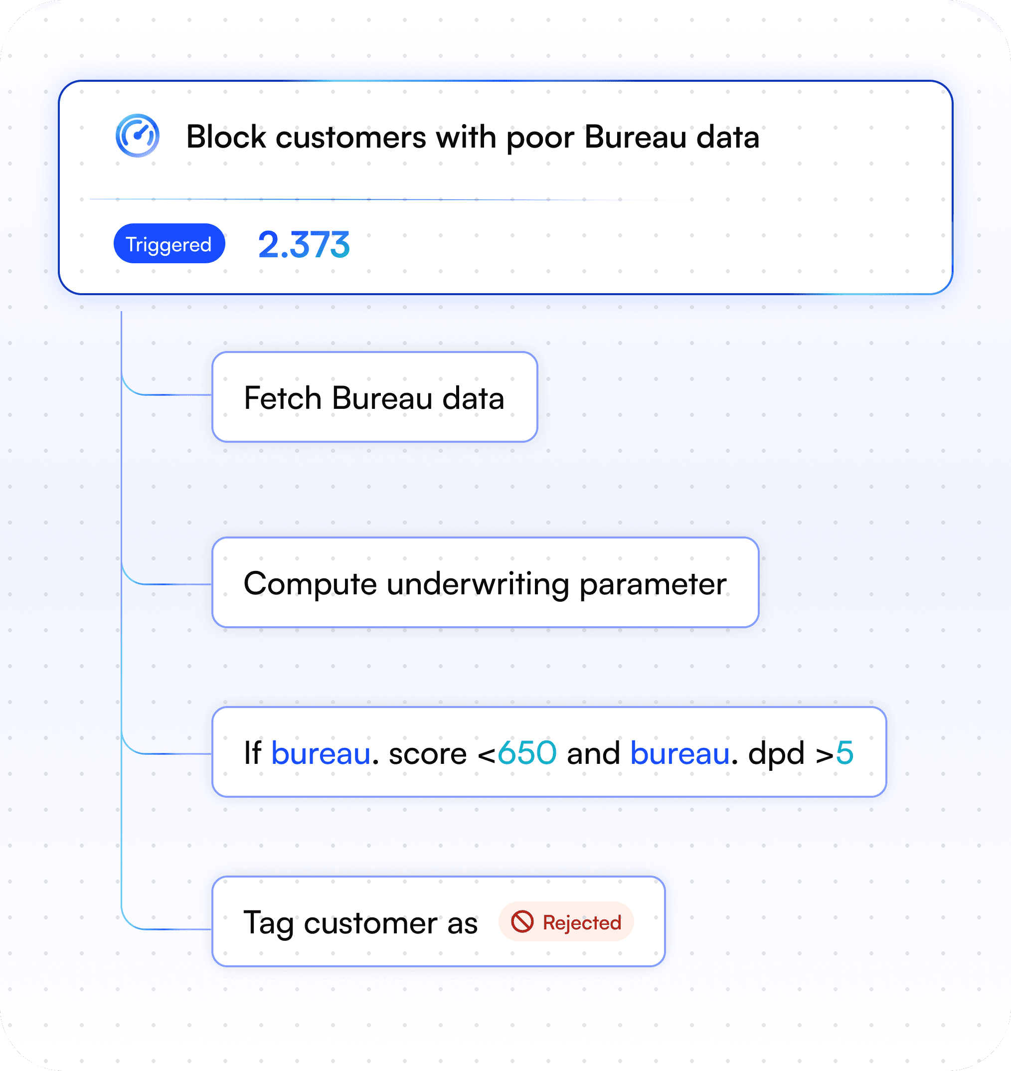 Policies for credit decisioning using Excel-intuitive language and stitch them together to make lending workflows. Test and validate rules as and when you create them. Backtest to see impact of workflow.