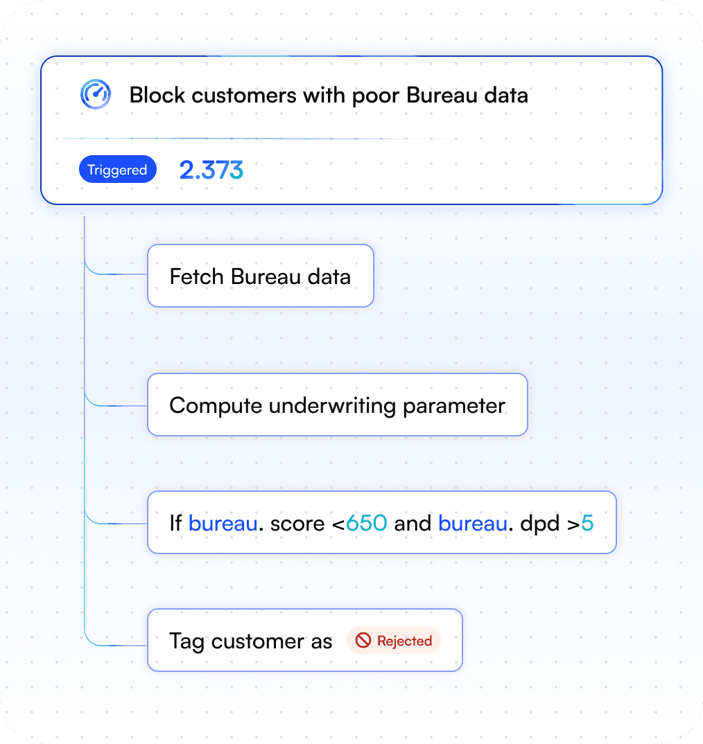 Policies for credit decisioning using Excel-intuitive language and stitch them together to make lending workflows. Test and validate rules as and when you create them. Backtest to see impact of workflow.